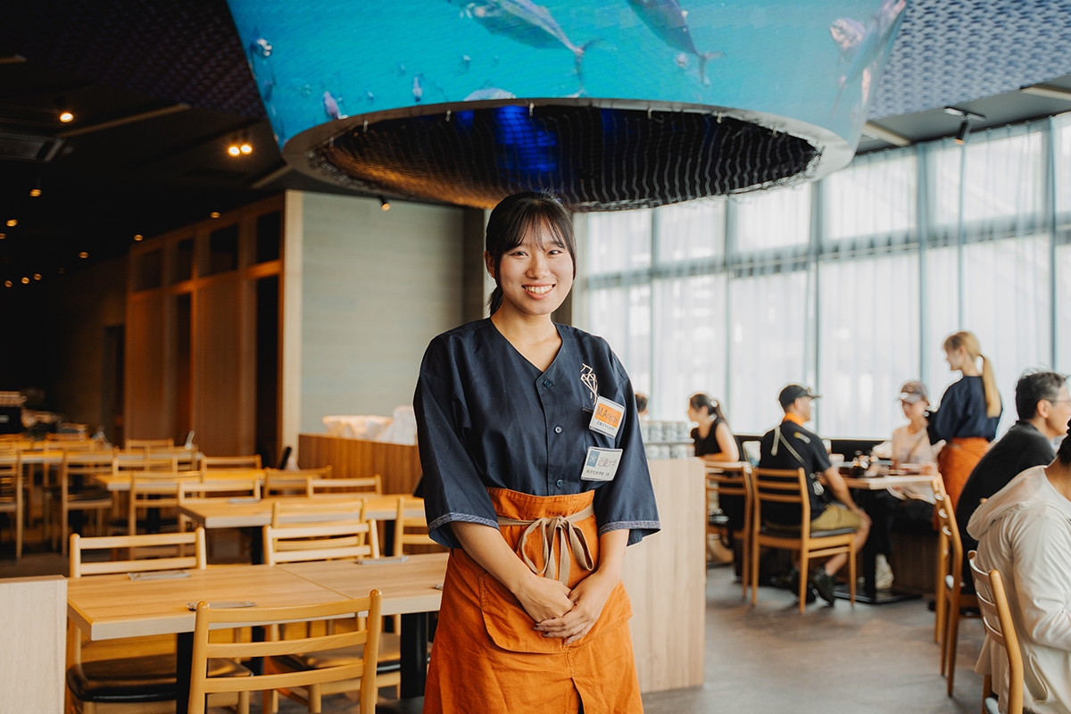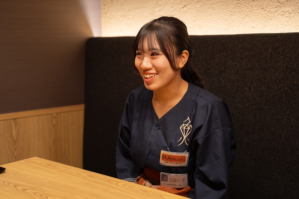 まずは「近大卒の魚と紀州の恵み 近畿大学水産研究所 大阪・関西万博 ウォータープラザ店」で働く、総合社会学部3年生の姉崎 萌亜(あねざき もあ)さんを訪ねました。