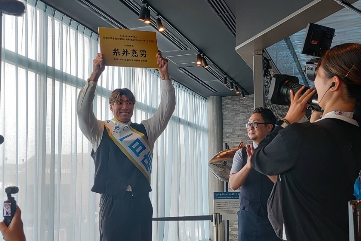 令和7年(2025年)10月3日(金)、「近畿大学水産研究所 大阪・関西万博 ウォータープラザ店」にて来店者10万人達成を記念し、卒業生で元プロ野球選手の「糸井嘉男氏」が一日店⻑をに就任し「大阪サンスポちゃんねる」で取材をされました。