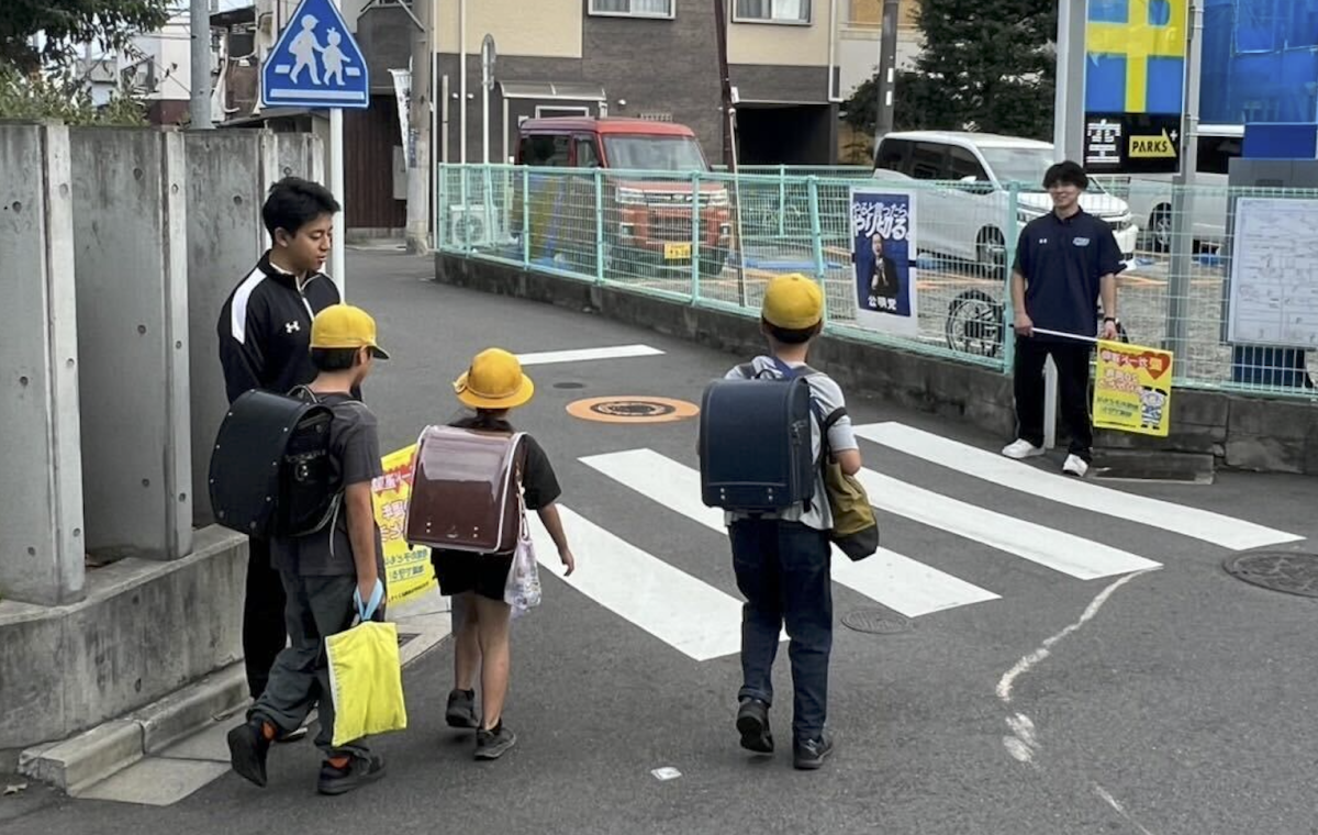 近大体育会メンバーが子供たちを「愛ガード」 危険な交差点で登校時の児童を見守り