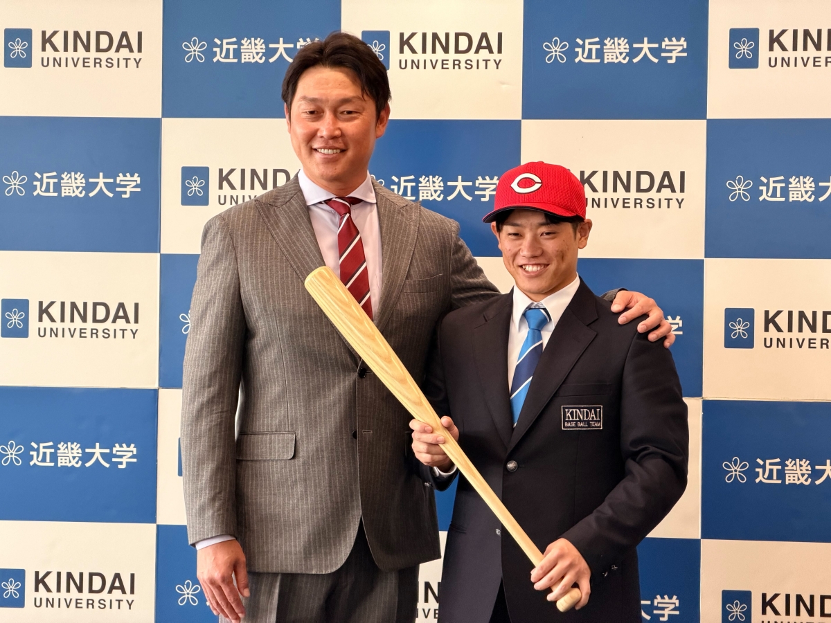 広島カープからドラフト3位指名を受けた近畿大学体育会硬式野球部の勝田成内野手が27日、東大阪キャンパスで新井貴浩監督、担当の鞘師智也スカウトから指名あいさつを受けた。