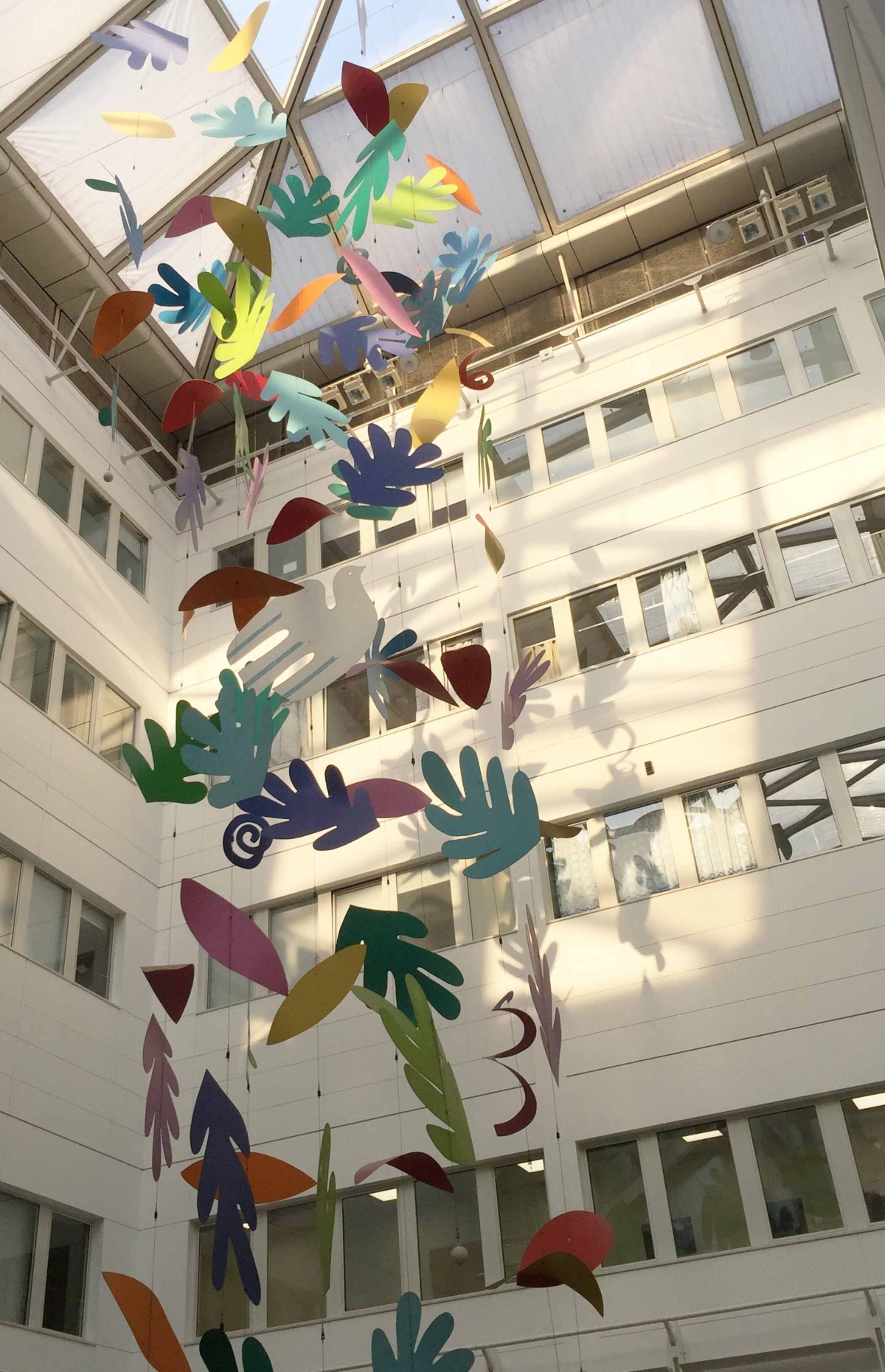 病院ロビーの天井は非常に高く、太陽光が降り注ぐ天窓があり、そこから全長24メートルを超えるモビールが吊り下がっています。