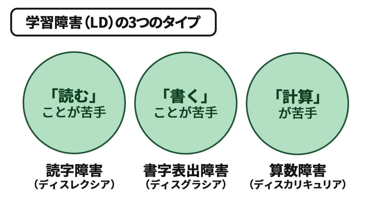 LD(学習障害)は、発達障害の一つで、「読む・書く・計算する」など特定の学習領域に困難が生じる状態を指す。
