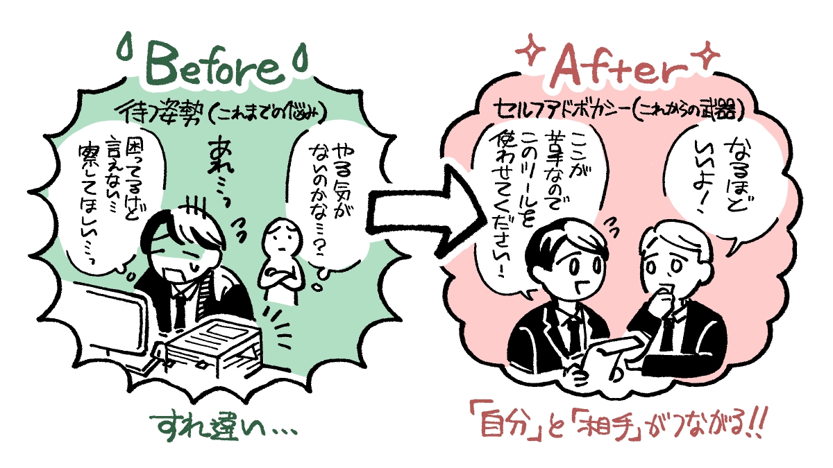 言葉は難しいですが、要は「自分と相手をつなぐこと」だと思ってください。「察してほしい」と待つのではなく、「私はここが苦手なので、代わりにこのツールを使わせてください」と自分で環境を整えにいくアクションのことです。就活中の学生が話していたのですが、最近は発達障害の人などに向けて合理的配慮をしてくれる会社が増えているそうです。そのこと自体はありがたいのですが、会社から「どんなサポートをすればいいですか?」と聞かれて、返答に困ってしまうことがあるそうです。そういったタイミングで、自分に必要なサポートをうまく伝えられるといいですね。