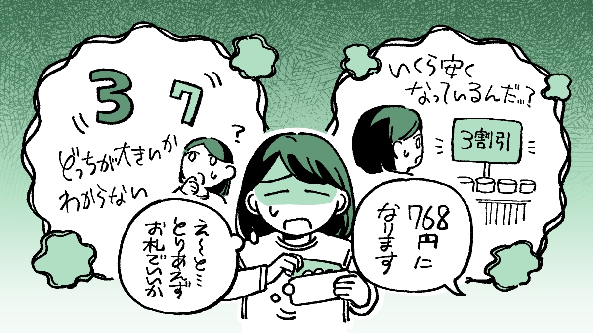 「3と7、どっちが大きいか分からない」「3割引と言われても、いくら安くなっているのか実感が湧かない」「財布から小銭をどう出せばいいか瞬時に判断できず、常にお札で払ってしまう」といった困りごとがあります。
