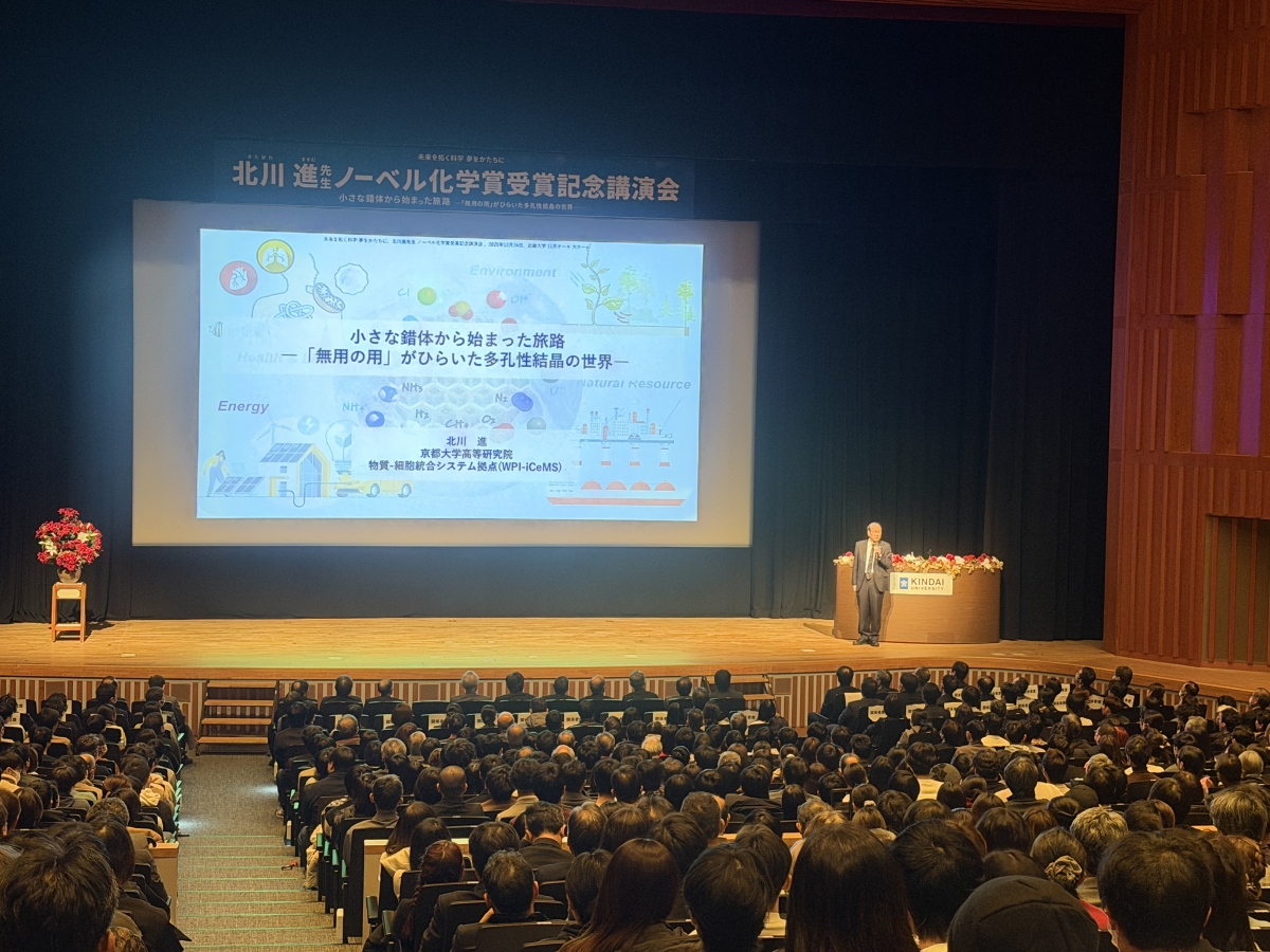 近畿大学理工学部は、ノーベル化学賞を受賞した京都大学理事・副学長・特別教授の北川進先生をお招きし、2025年12月24日(水)、東大阪キャンパスにて受賞記念講演会を開催しました。 北川先生は1979年から1992年までの13年間、近畿大学理工学部で教鞭をとられていました。