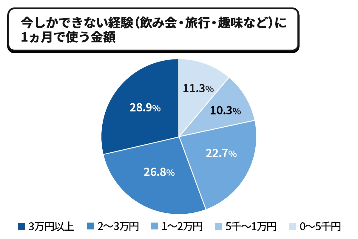 そのうちどのくらい「今しかできない経験」にお金を使っているか調べたところ、3万円以上が28.9%、2〜3万円が26.8%、1~2万円が22.7%という結果になりました。